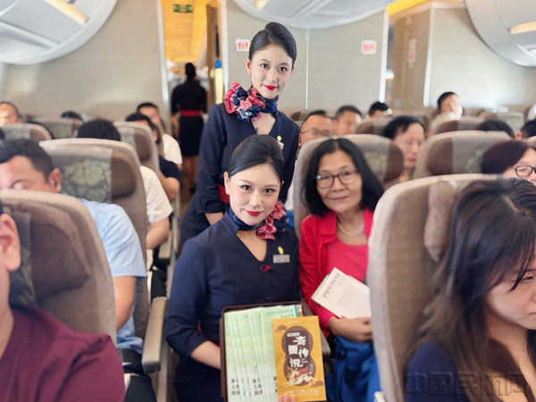 當(dāng)天的航程中,乘務(wù)組以“書香最抵人心,閱讀丈量世界”的特色廣播拉開序幕,帶領(lǐng)旅客踏上《典籍有意思·奇獸傳說(shuō)》主題之旅。“上圖·凌燕”志愿服務(wù)隊(duì)成員手持《坤輿圖說(shuō)》《營(yíng)造法式》等典籍復(fù)刻卷軸,穿梭客艙為旅客們講述古籍中的瑞獸傳奇。