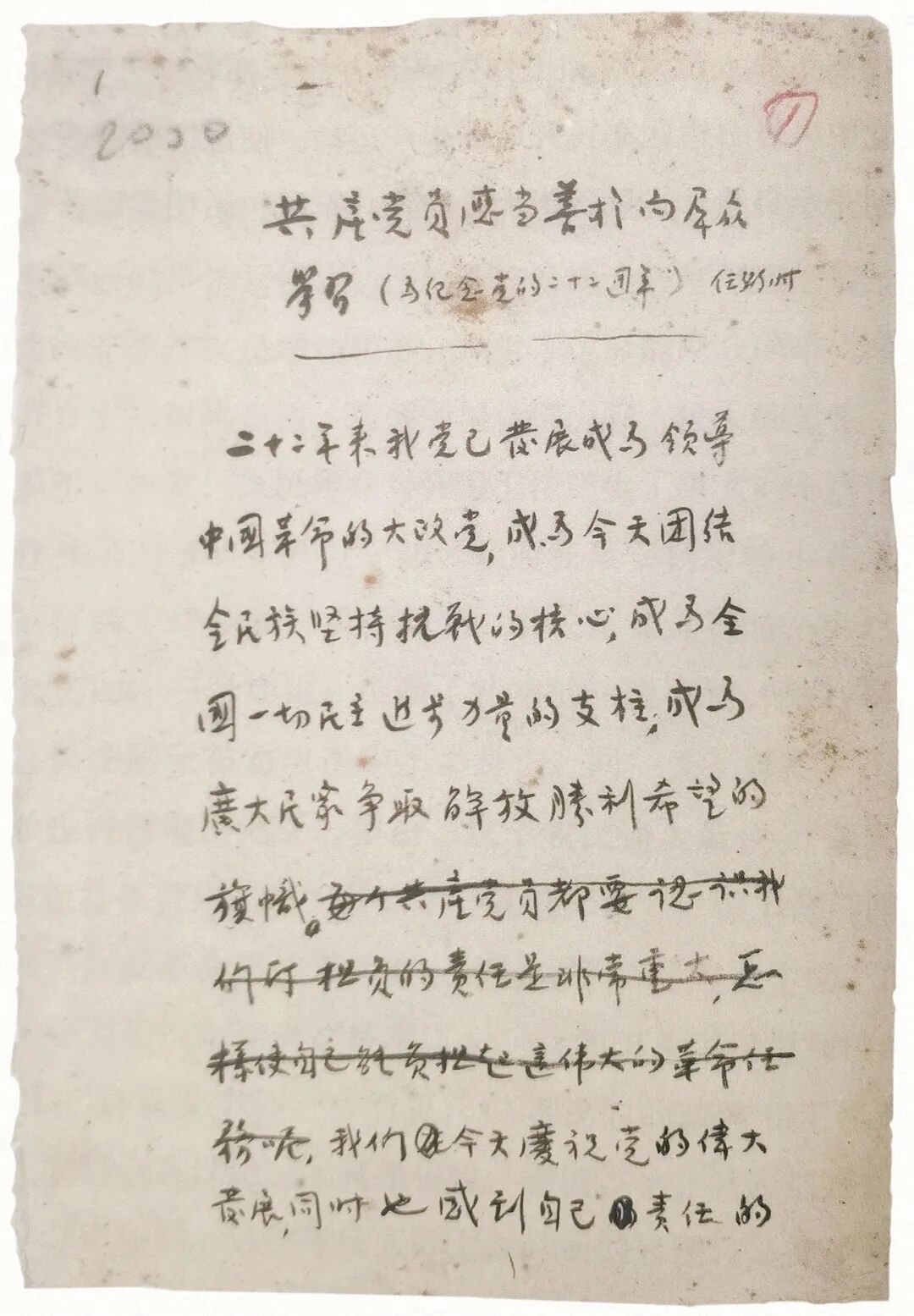 任弼時(shí)同志于1943年6月寫下的《共產(chǎn)黨員應(yīng)當(dāng)善于向群眾學(xué)習(xí)》。中央檔案館藏
